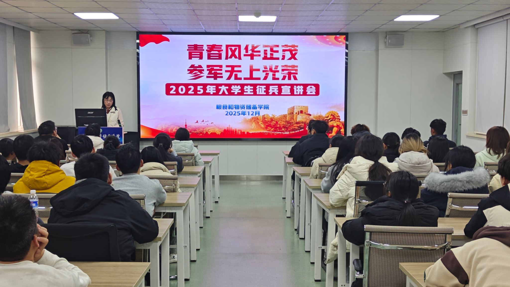 于12月9日在崇实楼202会议室举办2025年下半年征兵政策宣讲会。学院学工办主任马春艳、团委副书记刘宇畅全体辅导员及大一新生共同参与,现场气氛热烈,反响积极。