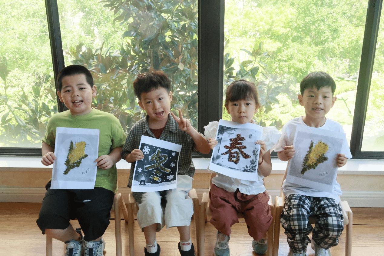 小朋友们展示自己制作的粮食画