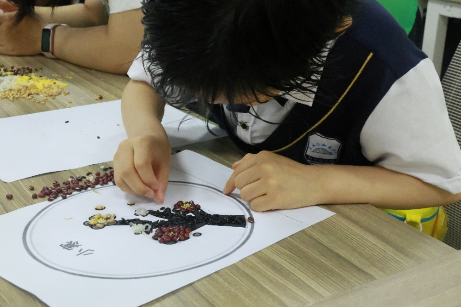 小朋友们亲手体验制作粮食画