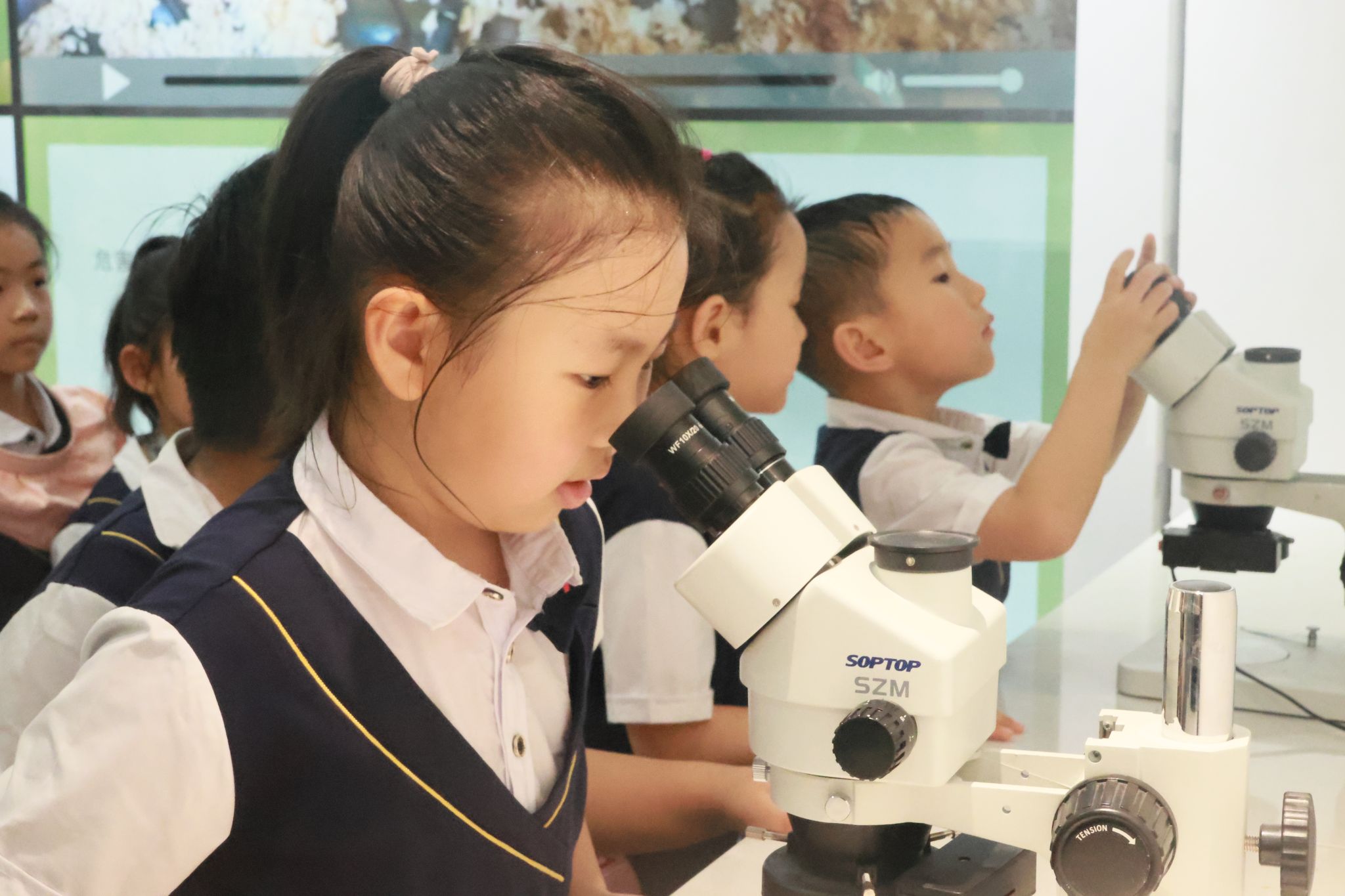 小朋友们通过显微镜观察储粮害虫