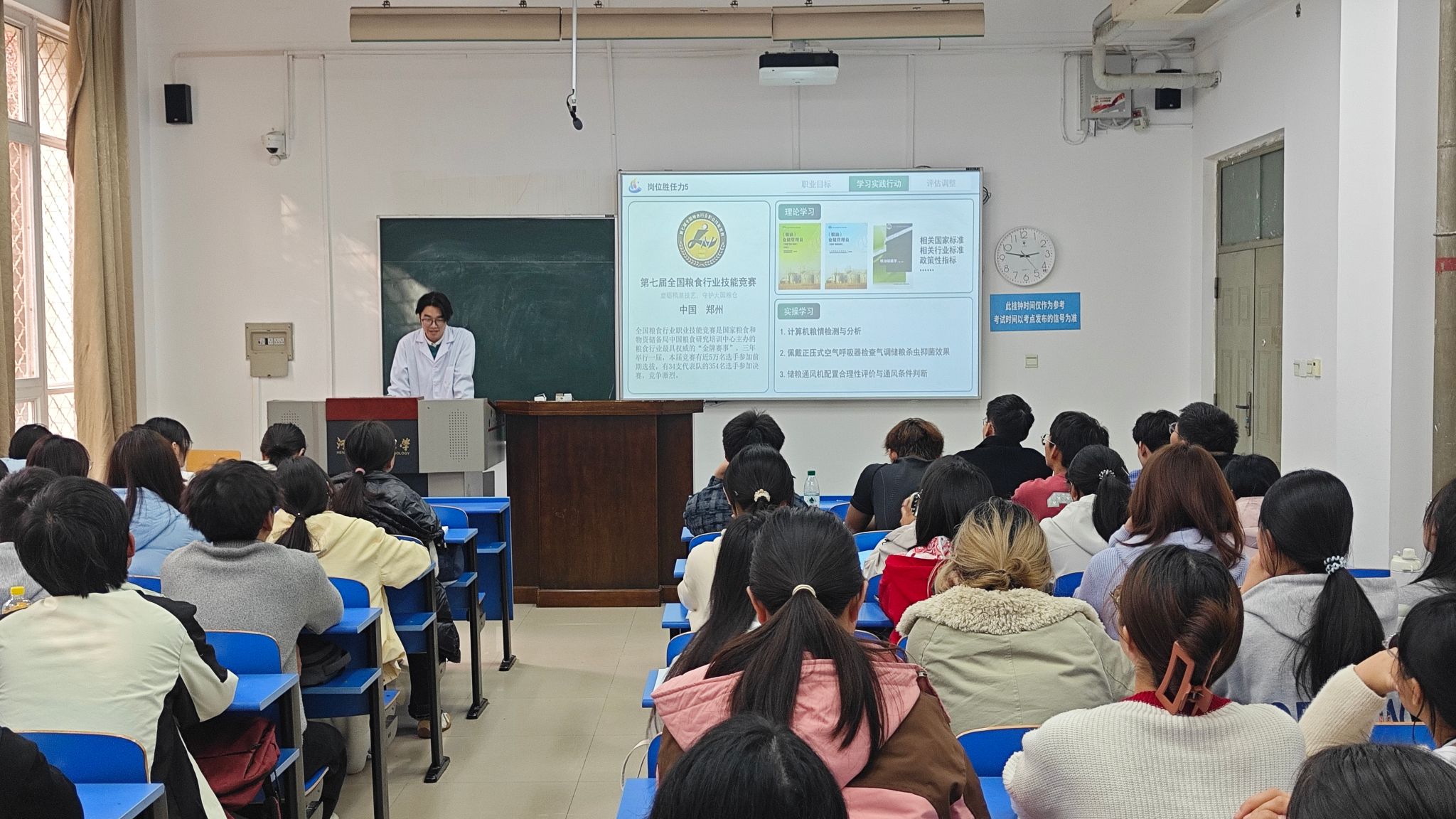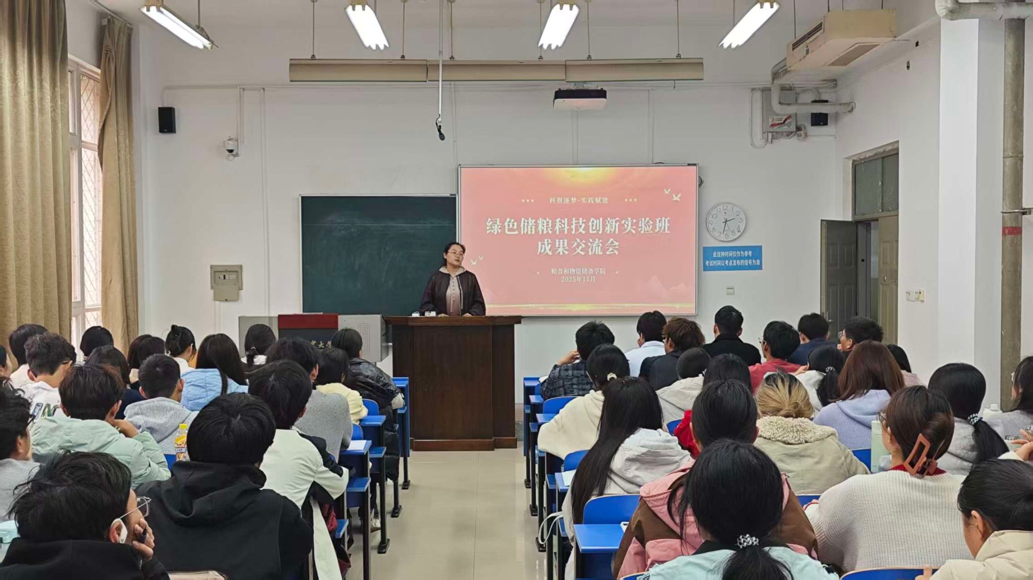 在4117教室举办“创新者说”绿色储粮科技创新实验班成果交流会。学院党委副书记梁艳、团委副书记刘宇畅、第七届全国粮食行业职业技能竞赛获奖师生与2025级全体本科生齐聚一堂,共探储粮科技创新人才的规划之路、成长之道。