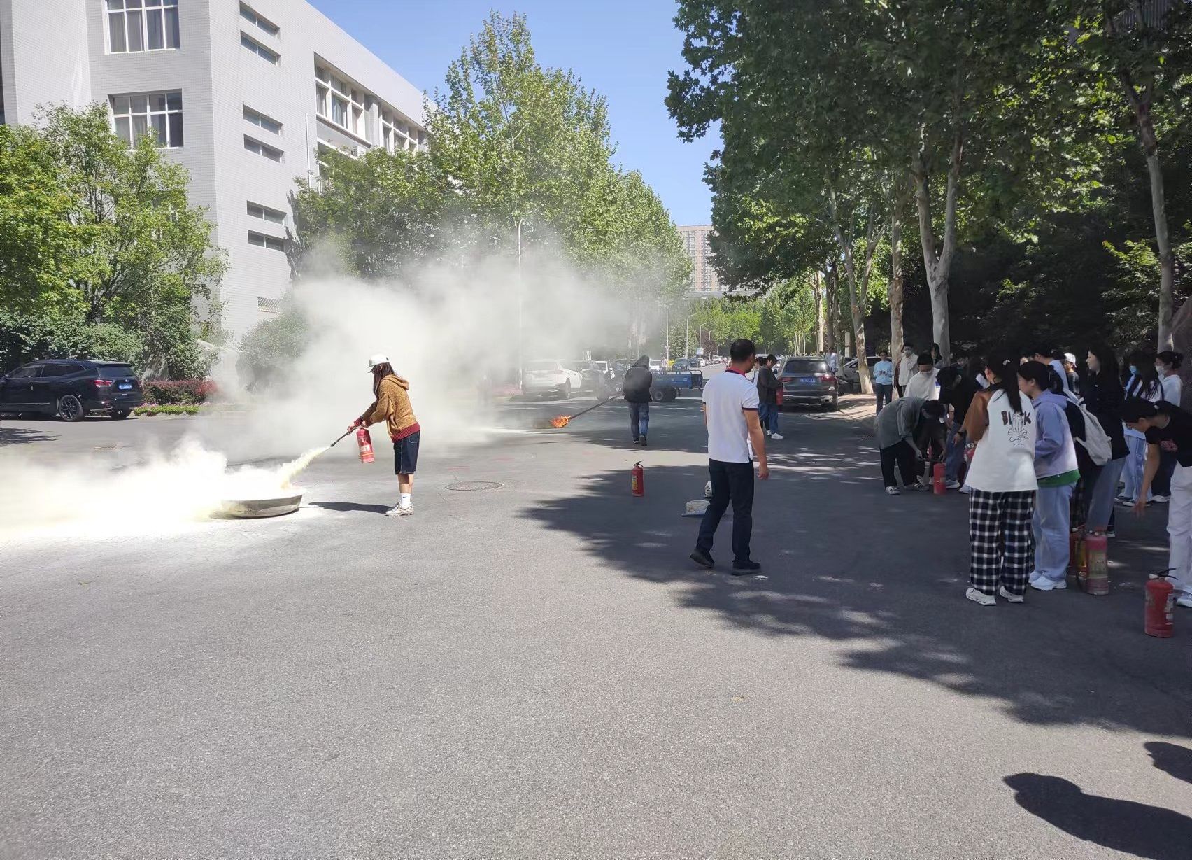 在消防应急演练环节,工作人员打开消防演习烟雾罐,释放烟雾,警铃响起。听到消防警报后,学院师生迅速掩住口鼻,有序进行紧急疏散,快速撤离到疏散安置点。同时,灭火组到达现场,迅速开展灭火救援、设备保障等工作,并现场指导师生学习使用灭火器扑灭火源,掌握“提、拔、瞄、压”的规范操作。