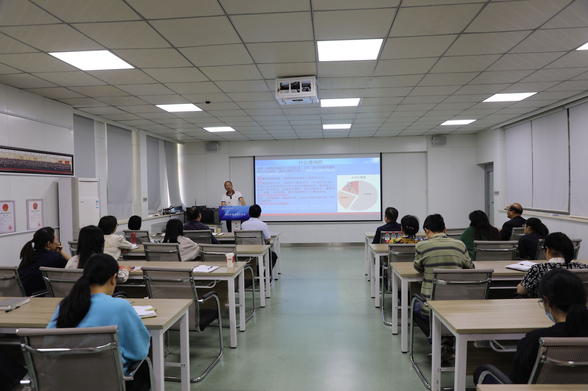 保卫处消防科孙志华老师围绕高校实验室安全规范、校园安全知识、实验室火灾扑救和着火案例、常见消防设施使用方法及消防逃生注意事项等内容进行详细讲解,有力提升了师生的安全意识和消防技能。