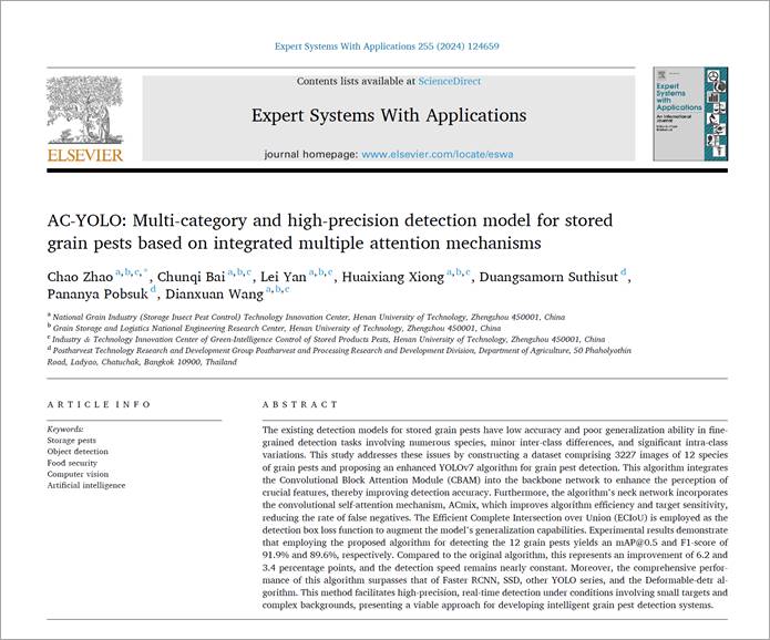 近日,学院储藏物害虫防治团队在储粮害虫智能检测技术领域取得了最新研究成果。该成果发表在人工智能领域国际顶级期刊Expert Systems With Applications(近三年平均影响因子8.2,中科院SCI一区Top,大类学科:计算机科学),河南工业大学为第一完成单位和通讯单位,学院赵超博士为第一作者和通讯作者。