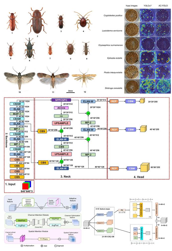 研究提出了一种增强的储粮害虫检测算法,该算法将CBAM集成到骨干网络中,增强对关键特征的感知,从而提高检测精度。在颈部网络引入了卷积自注意机制ACmix,提高了算法效率和目标敏感度,降低了漏检率。采用ECIoU作为检测框损失函数,增强了模型的泛化能力。实验结果表明, [email protected]和F1-score分别为91.9%和89.6%,综合性能显著优于Faster RCNN、SSD、YOLO系列和Deformable-detr等算法。
