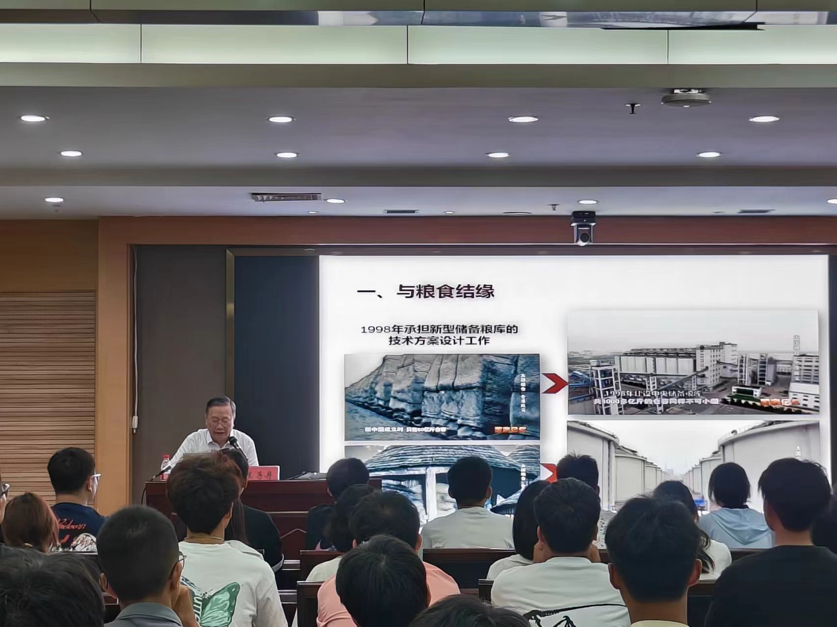 吴子丹从与粮食结缘、实事求很重要、科技发展无止境三个方面展开讲解,其用深情而平实的语言,从自身经历出发,生动且全面地展现了半个多世纪以来中国在粮食储藏领域历史、变化及未来发展趋势以及作为粮食储藏专业的学生,如何服务粮食行业发展。他向新生们表达了深切的期望:希望大家肩负起保障国家粮食安全的责任感;希望同学们培养科学精神和专业素养;倡议同学们学会团结学会合作学会包容。