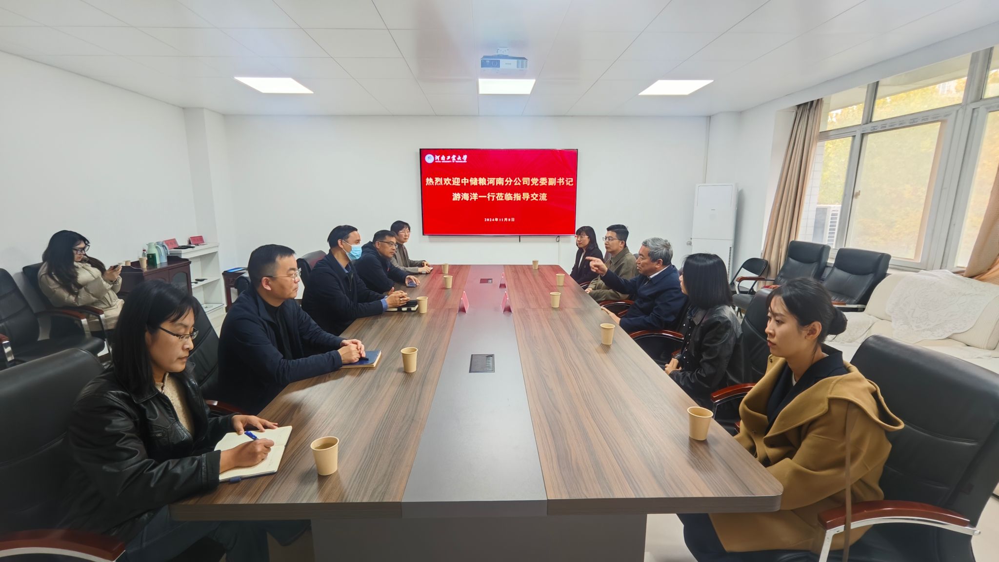 黄泽峰在会上首先向游海洋副书记一行表达了诚挚的欢迎,并对中储粮河南分公司长期以来对河南工业大学的鼎力支持表示了衷心的感谢。他围绕学校“双一流”创建的宏伟蓝图,介绍了学校在人才培养、学科建设以及学生就业等方面的丰硕成果与未来规划。他强调,学校正致力于通过深化粮食储藏与加工研究,打造粮食安全领域具有更大影响力的学科高峰,以期形成更具竞争力的学校发展目标。