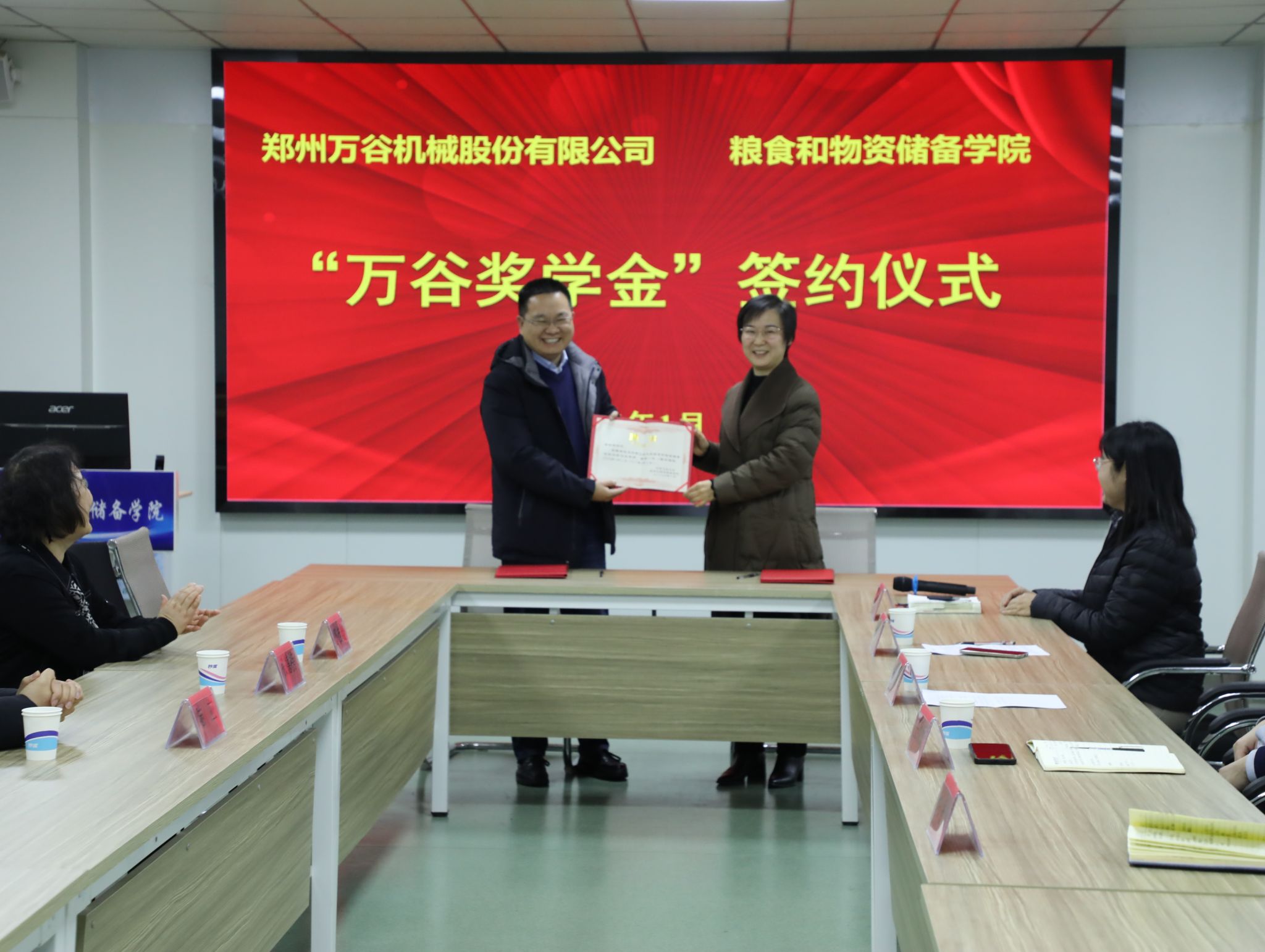 在崇实楼捷赛厅举行“万谷奖学金”签约仪式。郑州万谷机械股份有限公司副总经理张德榜、陆应,总工程师郭桂霞等三位校友,我校校友与基金工作办公室副主任王欣欣,看足球直播